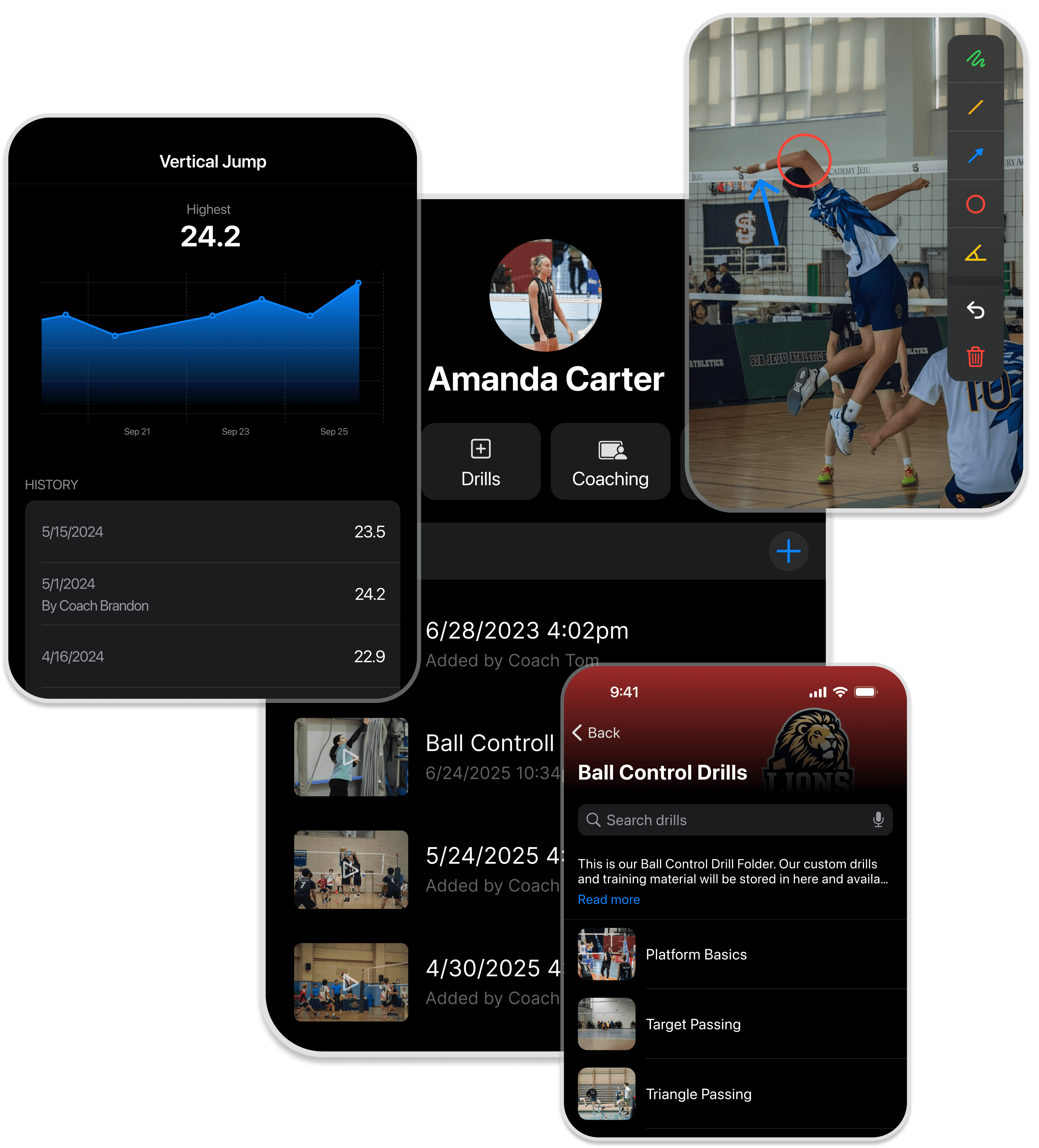 Track performance metrics like vertical jump, serve speed, and more